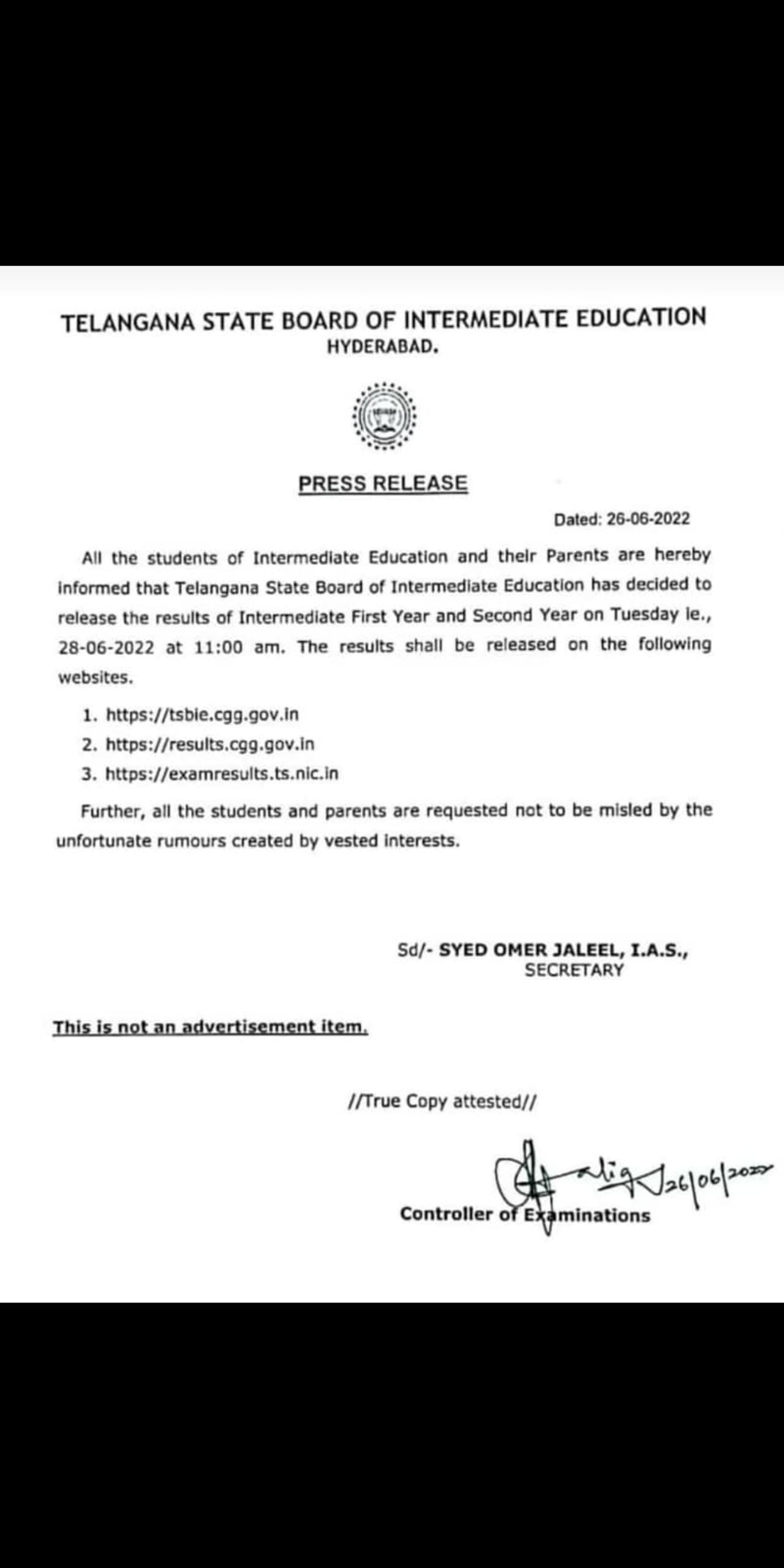 తెలంగాణలో ఇంటర్ ఫలితాలపై క్లారిటీ వచ్చింది. జూన్ 28న ఉదయం 11 గంటలకి రాష్ట్ర విద్యా శాఖ మంత్రి సబితా ఇంద్రా రెడ్డి ఫలితాలను విడుదల చేయనున్నారు.