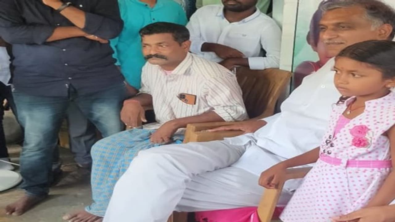 సిద్ధిపేట: తెలంగాణ మంత్రి హరీష్ రావు తన వీరాభిమాని తడబోయిన విజయ్ నివాసానికి వెళ్లారు. నర్సంపేట నియోజకవర్గం పరిధఇలోని నల్లబెల్లి మండలం పల్లి గ్రామంలోని తన అభిమాని విజయ్ నివాసానికి హరీష్ రావు వెళ్లారు. విజయ్ బాల్యం నుంచే హరీష్ రావు అభిమాని.