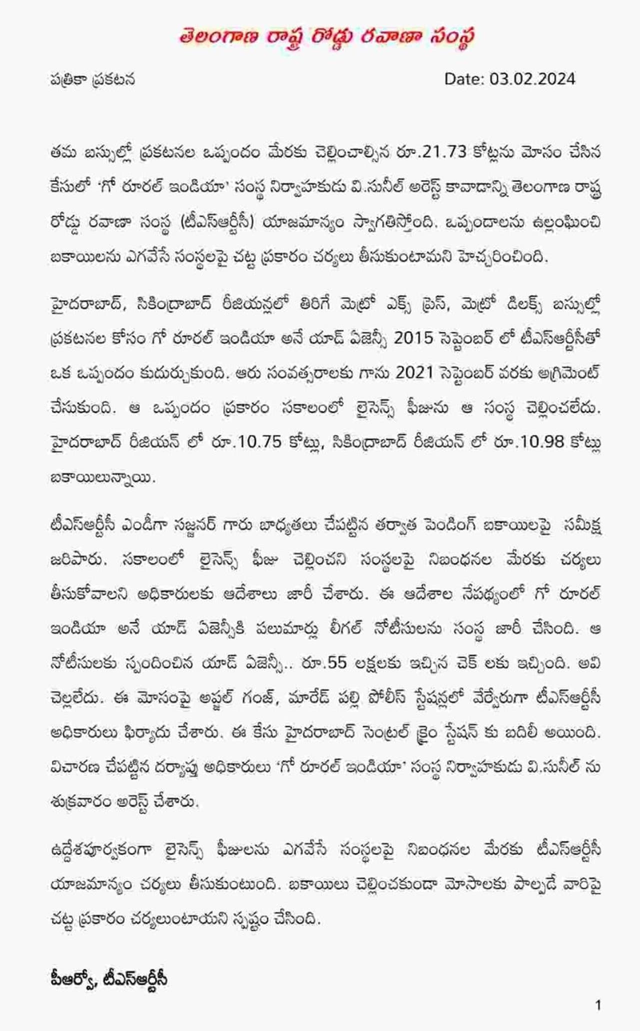 ఇలా తమ సంస్థను మోసం చేసిన గో రూరల్ ఇండియా సంస్థ నిర్వహకుడు సునీల్ అరెస్ట్ ను టీఎస్ ఆర్టిసి యాజమాన్యం స్వాగతిస్తూ ఓ ప్రకటన విడుదల చేసింది.