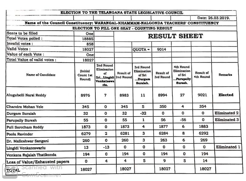 గెలుపొందిన యూటీఎఫ్ అభ్యర్థి నర్సిరెడ్డికి 8924 ఓట్లు రాగా, పీఆర్టీయూ అభ్యర్థి పూల రవీందర్కు 6287 ఓట్లు వచ్చాయి. ఇలా అధికార పార్టీ బలపర్చిన అభ్యర్ధిపై సిపిఎం మద్దతిచ్చిన నర్సిరెడ్డి విజయం సాధించడం సంచలనంగా మారింది. గతంలో టీఎస్ యూటీఎఫ్ రాష్ట్ర అధ్యక్షునిగా బాధ్యతలు నిర్వహించిన నర్సిరెడ్డి ఈ ఎమ్మెల్సీ ఎన్నికల్లో అధికార పార్టీకి గట్టి షాక్ ఇచ్చారు.