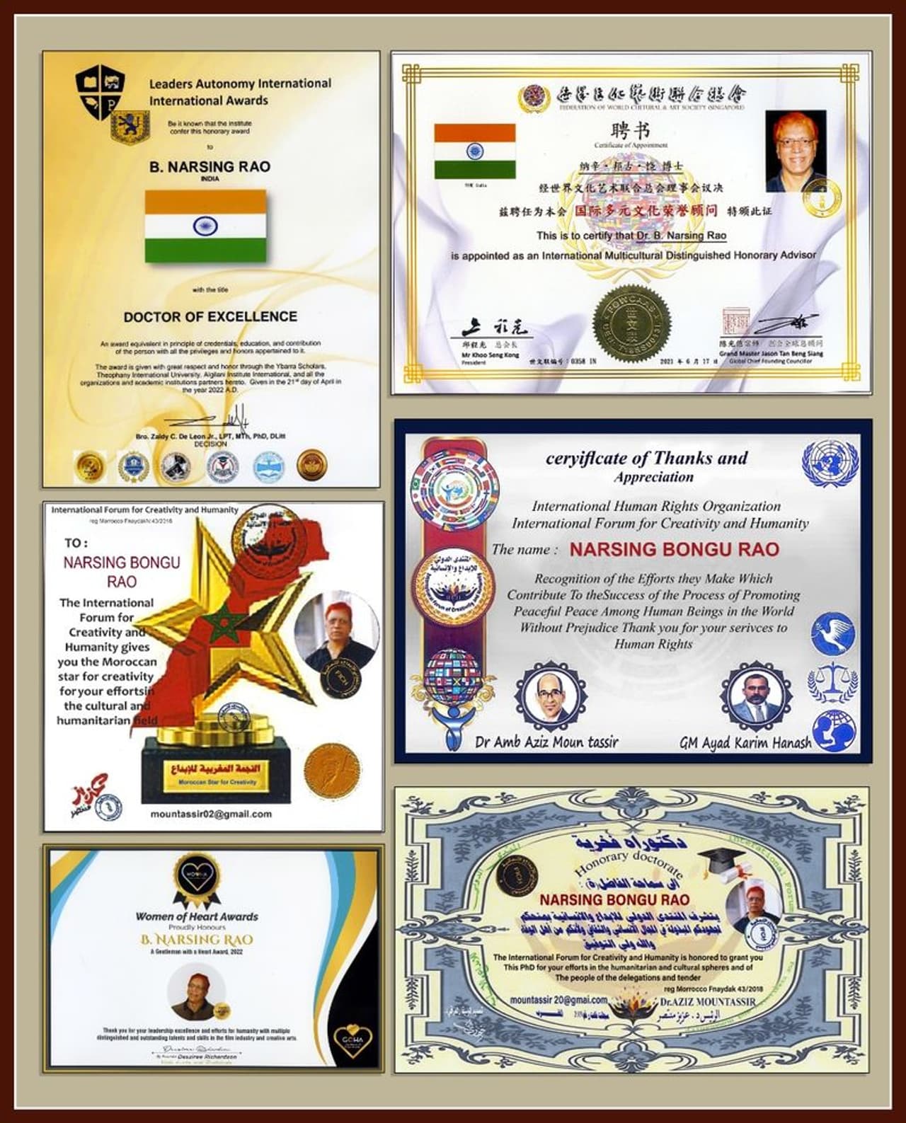 ప్రతిష్టాత్మక అంతర్జాతీయ సంస్థలు విశిష్ట వ్యక్తుల పేరిట నెలకొల్పిన పురస్కారాలు తనకు లభించాయని సోమవారం బి. నర్సింగరావు మీడియాకు తెలిపారు. రంగస్థలం, సినిమా, సంగీతం, చిత్రలేఖనం, శిల్పం, సాహిత్యం, జానపదం, ఫోటోగ్రఫీ రంగాల్లో ఎన్నో దశాబ్దాలుగా తాను చేసిన కృషికి గుర్తింపు లభించిందని ఆయన సంతోషం వెలిబుచ్చారు. సింగపూర్ కు చెందిన ది ఎలైట్ ఫెడరేషన్ అఫ్ వరల్డ్ కల్చరల్ అండ్ ఆర్ట్ సొసైటీ తనను గుర్తించి అంతర్జాతీయ సాంస్కృతిక గౌరవ సలహాదారులుగా నియమించినట్లు తెలిపారు.