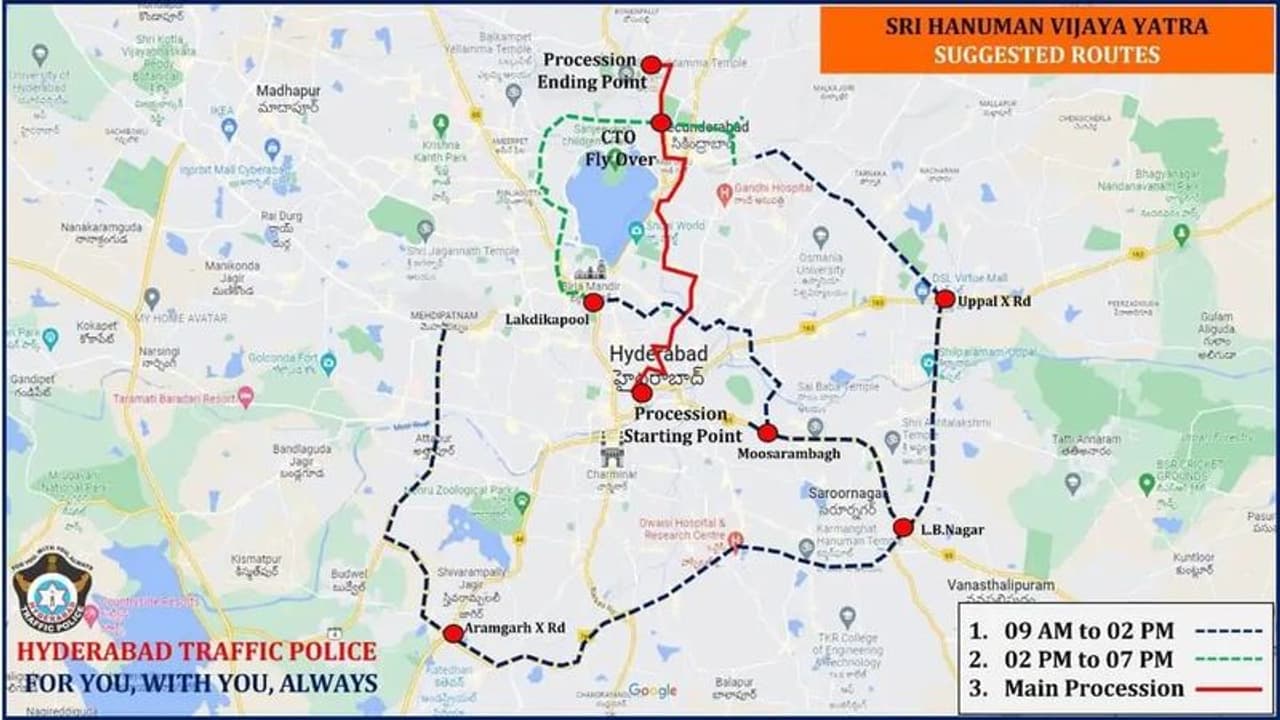 Hanuman Jayanthi procession: హనుమాన్ జయంతిని పురస్కరించుకుని శనివారం నిర్వహించనున్న ఊరేగింపు నేపథ్యంలో నగరంలో ట్రాఫిక్ ఆంక్షలు ఉంటాయని హైదరాబాద్ పోలీస్ కమిషన్ సీవీ ఆనంద్ పేర్కొన్నారు. ట్రాఫిక్ ఆంక్షలకు సంబంధించి ఒక నోటిఫికేషన్ జారీ చేశారు. హనుమాన్ జయంతి ఊరేగింపు 12 కిలోమీటర్ల మేర కొనసాగనుంది. ఆదివారం ఉదయం 11:30 గంటలకు ప్రారంభమయ్యే ప్రధాన శోభాయాత్ర గౌలిగూడ రామమందిరం నుంచి ప్రారంభమై సికింద్రాబాద్ హనుమాన్ మందిర్ తాడ్బన్ వరకు సాగుతుంది. ఈ ఊరేగింపు కొనసాగే మార్గాలు వరుసగా ఇలా ఉన్నాయి.. గౌలిగూడ రామమందిరం, పుత్లిబౌలి ఎక్స్ రోడ్లు, ఆంధ్రా బ్యాంక్ ఎక్స్ రోడ్లు, కోటి, తిలక్ రోడ్, సుల్తాన్ బజార్ ఎక్స్ రోడ్లు, రామ్ కోటి ఎక్స్ రోడ్లు, కాచిగూడ ఎక్స్ రోడ్లు, వీర్ సావర్కర్ విగ్రహం, నారాయణగూడ వైఎంసీఏ, చిక్కడపల్లి ఎక్స్ రోడ్లు , RTC 'X' రోడ్లు, అశోక్ నగర్, గాంధీ నగర్, వెనుక వైపు వైస్రాయ్ హోటల్, ప్రాగా టూల్స్, కవాడిగూడ, బన్సీలాల్ పేట్ గ్రేవ్ యార్డ్స్, బైబిల్ హౌస్, సిటీ లైట్ హోటల్, బాటా షో రూమ్, ఉజ్జయిని మహంకాళి టెంపుల్, రాంగోపాల్ పేట్ PS, ప్యారడైజ్ X రోడ్స్, CTO జంక్షన్, రాయల్ లీ ప్యాలెస్, బ్రూక్బాండ్, ఇంపీరియల్ గార్డెన్, మస్తాన్ కాస్ఫే, హనుమాన్ మందిర్ తాడ్బన్.