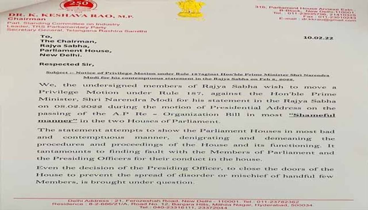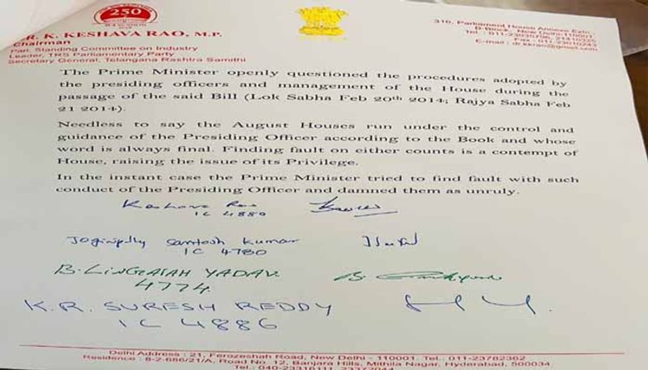 Parliament లో పాస్ అయిన బిల్లును అవహేళ చేయడం సరికాదని టీఆర్ఎస్ ఎంపీలు కోరుతున్నారు. రాజ్యసభలో తెలంగాణపై ప్రధాని మోడీ చేసిన వ్యాఖ్యలు సభా హక్కుల ఉల్లంఘన కిందకే వస్తుందని టీఆర్ఎస్ ఎంపీలు అభిప్రాయపడుతున్నారు.ప్రధానిపై ప్రివిలేజ్ మోషన్ ఇచ్చిన విషయాన్ని టీఆర్ఎస్ ఎంపీ కె. కేశవరావు ఇవాళ రాజ్యసభలో ప్రస్తావించారు. ప్రివిలేజ్ మోషన్ నోటీస్ ను రాజ్యసభ ఛైర్మెన్ పరిశీలన కోసం పంపామని రాజ్యసభ డిప్యూటీ చైర్మెన్ హరివంశ్ చెప్పారు.