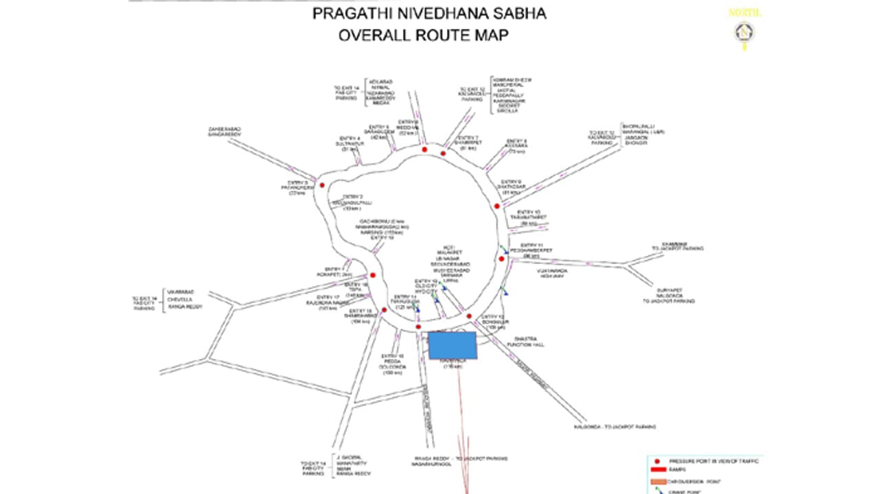 విజయవాడ హైవేలో ఖమ్మం, భద్రాద్రి కొత్తగూడెం, సూర్యాపేట జిల్లాలతోపాటు, నల్లగొండ జిల్లాలోని నకిరేకల్, నల్లగొండ, మునుగోడు నియోజకవర్గాల నుంచి వచ్చే వాహనాలు పెద్ద అంబర్పేట ఓఆర్ఆర్ వద్ద సర్వీస్రోడ్డు నుంచి కోహెడ, మంగల్పల్లి మీదుగా కొంగరకలాన్కు చేరుకుని జాక్పాట్ వెంచర్/ టీఎస్ఐఐసీ భూముల్లో పార్కింగ్ చేయాలని పోలీసులు సూచించారు.
