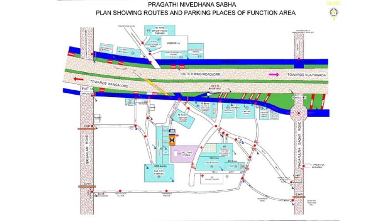 రాష్ట్రం నలుమూలల నుంచి వచ్చే వాహనాలు ఏమార్గంలో ప్రయాణించాలి, పార్కింగ్ స్థలం ఎక్కడ అనేదానిపై మ్యాప్ను రూపొందించారు. 1500 ఎకరాల్లో ఏర్పాటుచేసిన 20 పార్కింగ్ ప్రదేశాల్లో దాదాపు లక్ష వాహనాలను నిలిపేలా రూట్ మ్యాప్ ను తయారు చేశారు. జిల్లాల వారీగా వచ్చే వాహనాలు ఎక్కడ పార్కింగ్ చెయ్యాలో అన్న అంశాన్ని పోలీస్ శాఖ క్లియర్ గా తెలియజేసింది.