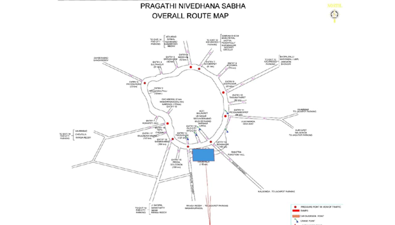 శ్రీశైలం హైవేలో అచ్చంపేట, కొల్లాపూర్, నాగర్కర్నూల్, కల్వకుర్తి, మహేశ్వరం నుంచి వచ్చేవాహనాలు రాచులూర్ గేట్ నుంచి తిమ్మాపూర్-కొంగరకలాన్ రంగారెడ్డి కలెక్టరేట్ వద్ద ఉన్న జాక్పాట్/టీఎస్ఐఐసీ భూముల్లో వాహనాలను పార్క్ చేయాలని సూచించారు.