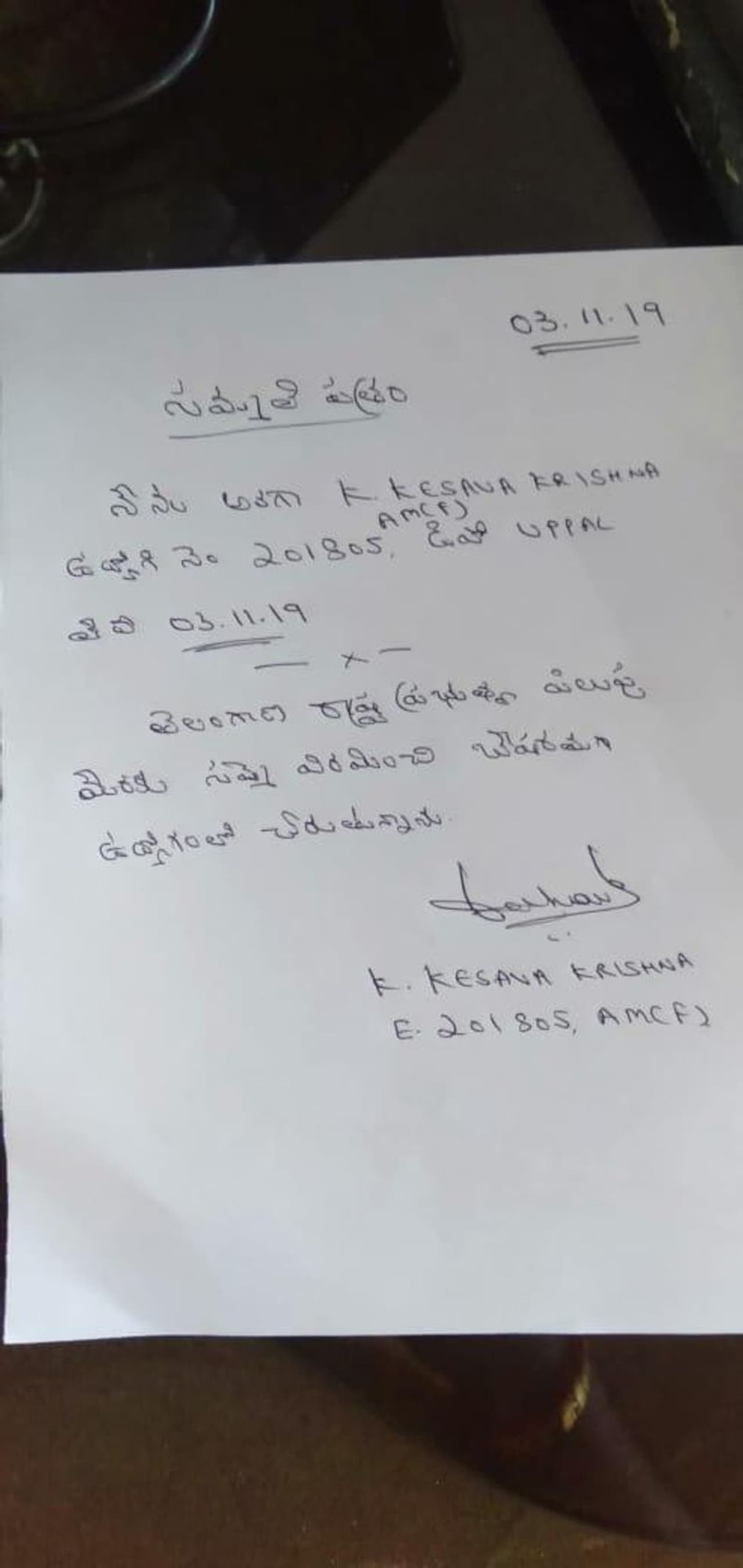సీఎం కేసీఆర్ చివరి అవకాశమని హెచ్చరించడంతో ఆదివారం నాడు పలు డిపోల్లో ఆర్టీసీ కార్మికులు విధుల్లో చేరేందుకు సిద్దమయ్యారు. ఉమ్మడి నిజామాబాద్ జిల్లాలోని కామారెడ్డి ఆర్టీసీ బస్ డిపో కు చెందిన ఆర్టీసీ డ్రైవర్ సయ్యద్ హైమత్ ఆదివారం నాడు విధుల్లో చేరారు.ఈ మేరకు డిపో మేనేజర్ కు సయ్యద్ హైమత్ (స్టాఫ్ నెంబర్ 318188) డీఎంకు లేఖను అందించారు. కామారెడ్డి డీఎం గణపతిరాజుకు లేఖను ఇచ్చారు.