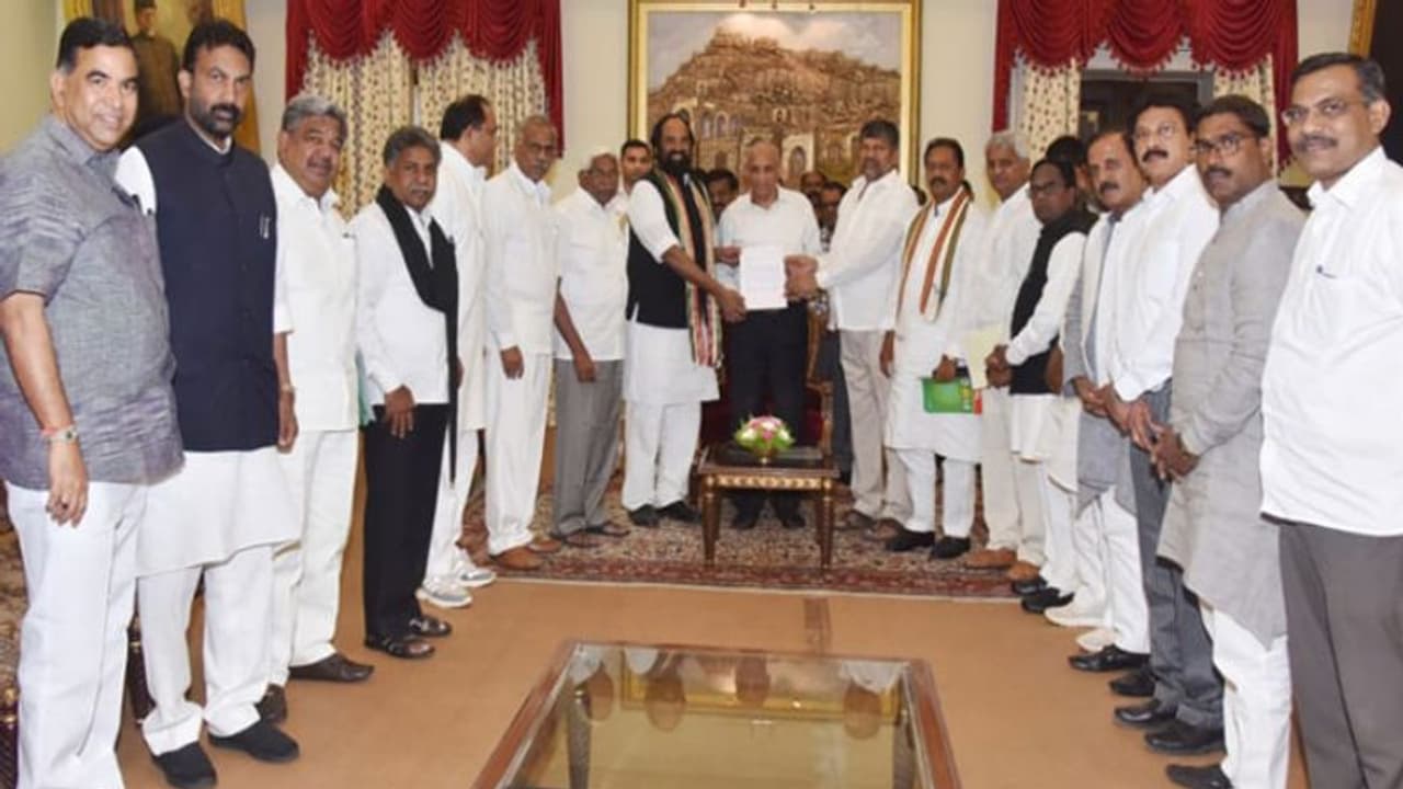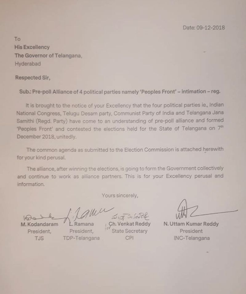 సోమవారం నాడు రాజ్భవన్లో గవర్నర్ నరసింహాన్తో సమావేశమైన తర్వాత ప్రజా కూటమి నేతలు మీడియాతో మాట్లాడారు.ఎన్నికలకు ముందు కాంగ్రెస్, టీడీపీ, సీపీఐ, టీజేఎస్లు , ఎమ్మార్పీఎస్, తెలంగాణ ఇంటి పార్టీలు పోటీ చేసిన విషయాన్ని డాక్యుమెంట్ సహా గవర్నర్కు సమర్పించినట్టు చెప్పారు. ఎన్నికల కమిషన్ కు సమర్పించిన డాక్యుమెంట్లను కూడ గవర్నర్ కు అందించినట్టు ఉత్తమ్ కుమార్ రెడ్డి తెలిపారు.