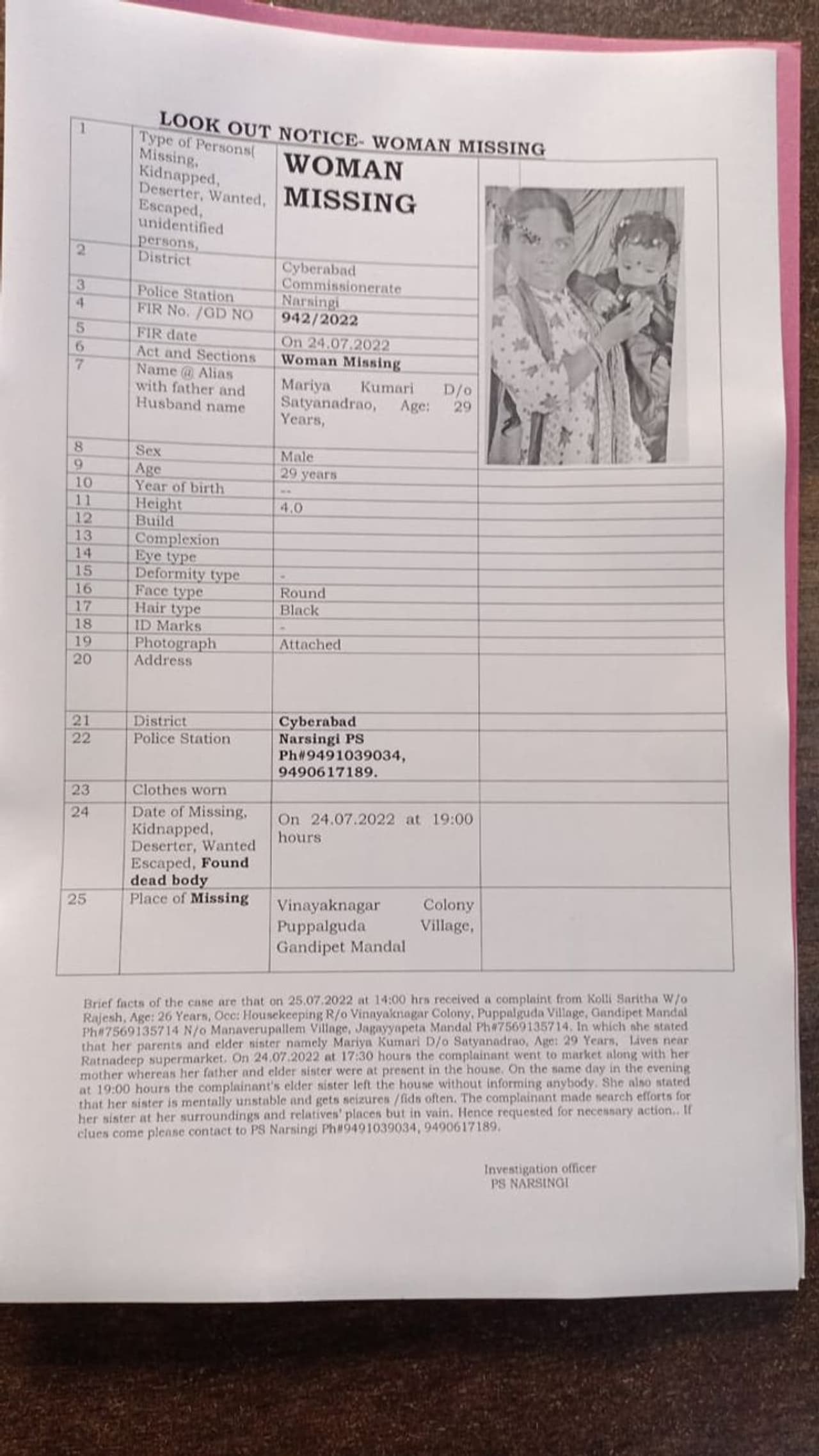 మరియమ్మ తల్లి ఇంట్లో పనులకు వెళ్లగా.. కూతురి కోసం తండ్రి ఇంటివద్దే ఉంటూ చూసుకుంటున్నాడు. మరియమ్మ తప్పిపోయిన రోజు కూడా తండ్రి ఇంటివద్దే ఉన్నాడు. తండ్రి చూస్తాడని అతనికి కనిపించకుండా ఇంట్లో నుంచి బయటపడింది. ఆ తరువాత నార్సింగికి వెళ్లింది. ఆ తరువాత ఎక్కడికి వెళ్లిందో తెలియదు. కూరగాయల మార్కెట్ కు వెళ్లిన తల్లి, చెల్లెళ్లు ఇంటికి వచ్చేసరికి ఆమె కనిపించకపోవడంతో వెతకడం మొదలుపెట్టారు. రాత్రంతా అన్ని చోట్లా వెతికి సోమవారంనాడు నార్సింగి పోలీసులకు ఫిర్యాదు చేశారు.