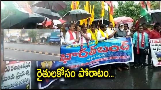 విజయవాడ: గులాబ్ తుఫాను కారణంగా జోరున వాన కురుస్తున్న ఆంధ్ర ప్రదేశ్ లో బంద్ కొనసాగుతోంది. కేంద్ర ప్రభుత్వం తీసుకువచ్చిన మూడు వ్యవసాయ చట్టాలను వ్యతిరేకిస్తూ సంయుక్త కిసాన్ మోర్చా (ఎస్కేఎం) ఆధ్వర్యంలో 500కు పైగా రైతు, ప్రజాసంఘాలు నేడు భారత్ బంద్ (Bharat Bandh)కి పిలుపునిచ్చిన విషయం తెలిసిందే. ఈ బంద్ కు ఏపీ ప్రభుత్వం సహా కాంగ్రెస్, వామపక్షాలు మద్దతు తెలిపాయి. అయితే గులాబ్ తుఫాను ప్రభావంతో సోమవారం ఏపీలో భారీ వర్షాలు కురుస్తున్నాయి. జోరువానను సైతం లెక్కచేయకుండా విజయవాడలో వామపక్ష పార్టీల నాయకులు బంద్ లో పాల్గొన్నారు. గొడుగు పట్టుకుని వర్షంలోనే విజయవాడ బస్టాండ్ వద్దకు చేరుకున్న వివిధ పార్టీ నేతలు, కార్యకర్తలు రైతులకు మద్దతుగా బంద్ చేపట్టారు.