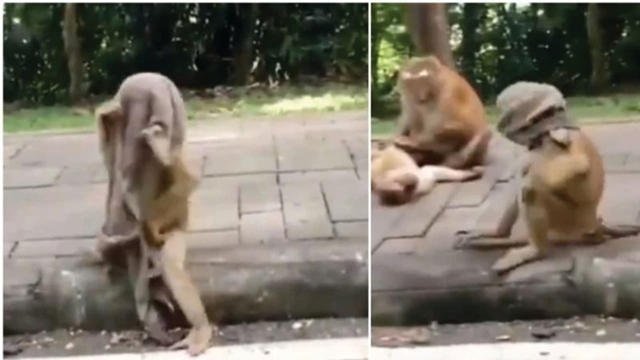 కరోనా బారినపడకుండా ఉండాలంటే మాస్కులు పెట్టుకోవాలని ప్రభుత్వం సూచిస్తోంది. అయితే, ఓ కోతి మాత్రం తన సేఫ్ కోసం మాస్కు ధరించాలని నిర్ణయించుకుంది. అంతే రోడ్డు మీద దొరికిన ఓ టవల్ను ముఖానికి చుట్టుకుంది.