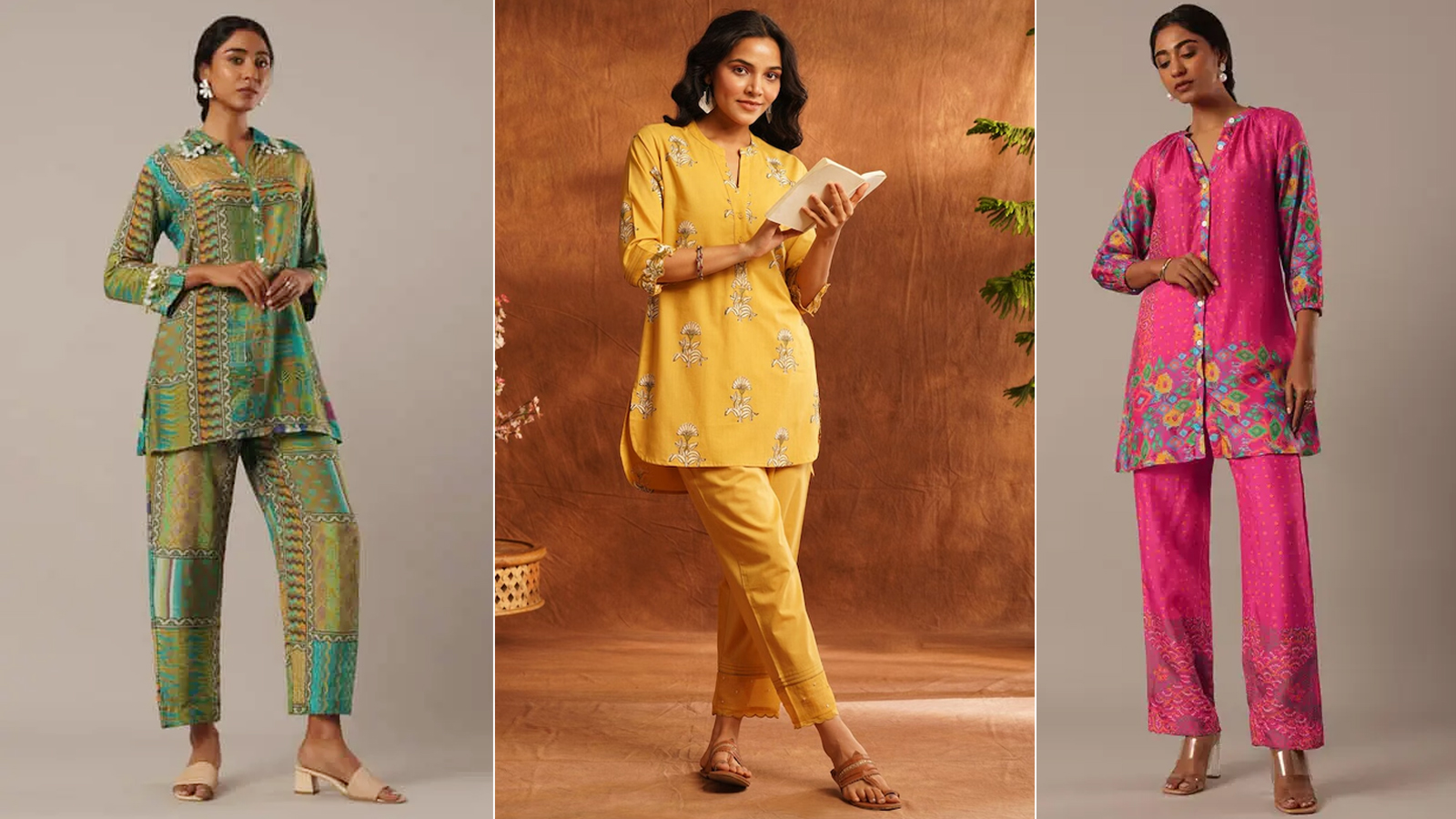 కో-ఆర్డ్ సెట్స్: పైన, కింద డ్రెస్ ఒకే ప్యాట్రన్, కలర్, ఫాబ్రిక్ తో ఉంటాయి. స్టైలిష్ గా, పాలిష్డ్ లుక్ ఇస్తాయి. బయటకి వెళ్ళడానికి, ప్రయాణించడానికి, లౌంజ్ చేయడానికి వీటిని వేసుకోవచ్చు. ప్యాంట్-టాప్, షార్ట్స్-షర్ట్, క్రాప్ టాప్-ప్లాజో లాంటి స్టైలిష్ వెరైటీలు ఇప్పుడు ట్రెండ్ లో ఉన్నాయి.